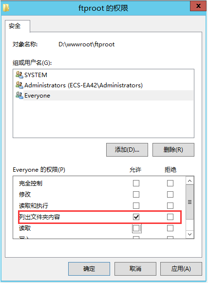 6,给FTP匿名目录everyone列出文件夹内容权限,也可以加上读取权限其他的全部取消打钩,如果您使用C盘默认的那个FTP则可以不用给